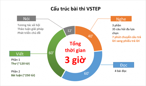 Kỳ thi VSTEP đánh giá 4 kỹ năng Nghe, Đọc, Viết, Nói với tổng thời gian thi khoảng 180 phút (3 giờ). Dưới đây là cấu trúc chi tiết từng phần trong kỳ thi: